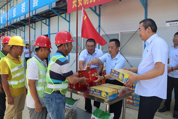 揭牌儀式結(jié)束后,結(jié)合“送清涼,戰(zhàn)酷暑”省建設(shè)工會在行動,傅愛萍副書記與長安制藥黨支部書記汪立冬、萬泰工會主席顏利代表省建設(shè)工會和海南萬泰工會為項目工友送上了一份份防暑降溫慰問品,為辛勤堅守在一線工作崗位上的勞動者帶來絲絲“清涼”,也表達了對一線職工的關(guān)懷。